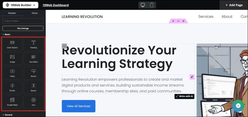 You can do that with 10Web’s drag-and-drop editor based on Elementor, which provides a wide range of widgets, content blocks, and enhancements—allowing you to fully tailor the AI-generated design to your business needs.