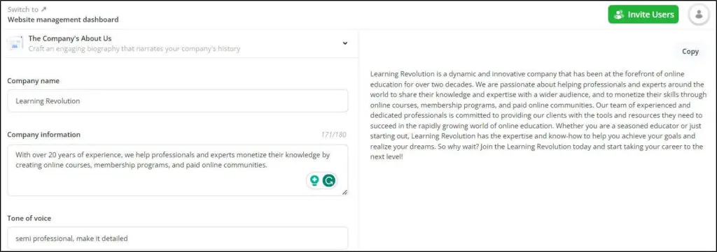 Once you’ve set up your site, you can use 10Web as a dedicated AI content creation tool for your blog and social media profiles. While it doesn’t yet rival advanced AI writing tools like Jasper or Writesonic, it still provides a strong starting draft for content, especially for beginners. With its “Enhance with AI” feature, you can rewrite content for better SEO optimization or adjust tone and style for specific platforms like Instagram or LinkedIn.