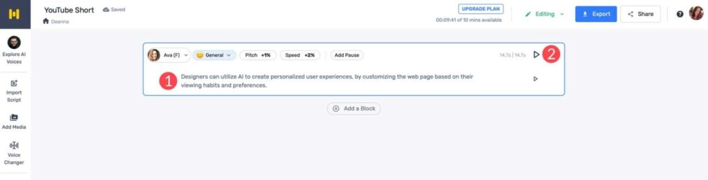 We’ll copy the first section of the script and paste it into Murf AI. Click the play icon on the right to generate the audio clip. Once complete, you can preview your clip using the same button.
