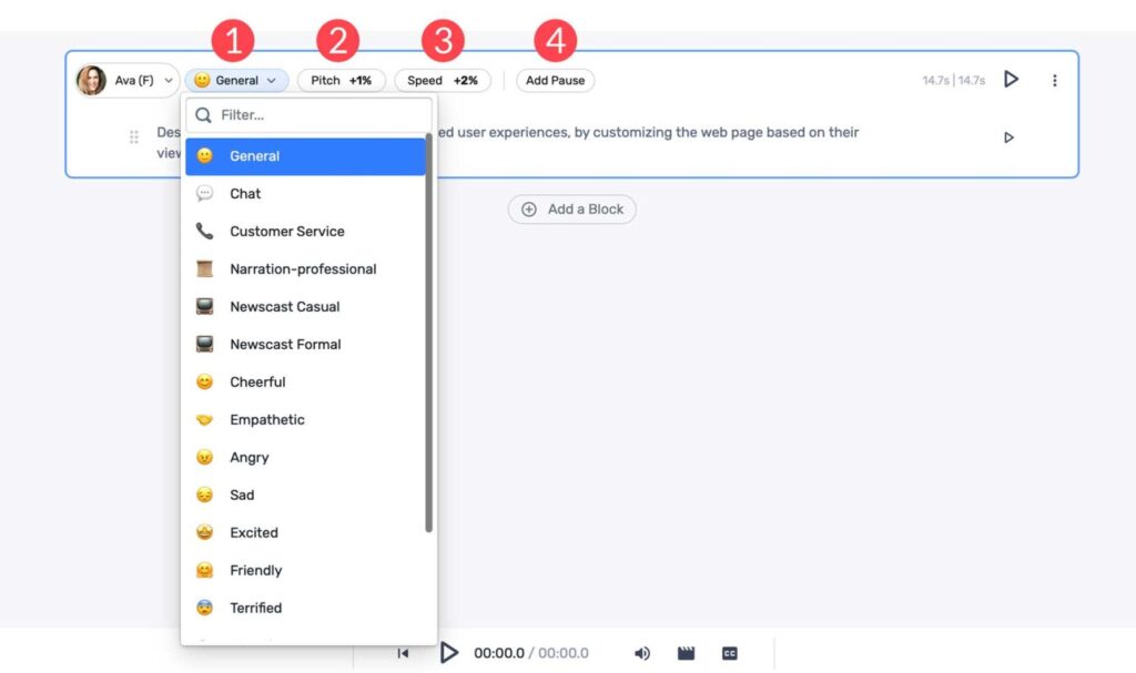 Once your audio is generated, you can preview the audio using the same play button. Murf AI comes with a few settings to help you adjust the output. These include tone (1), pitch (2), speed (3), and the ability to add a pause (4). These come in handy if the generated voice is too computer-like, has awkward run-on sentences, or needs to be adjusted to a lower or higher sound (pitch).